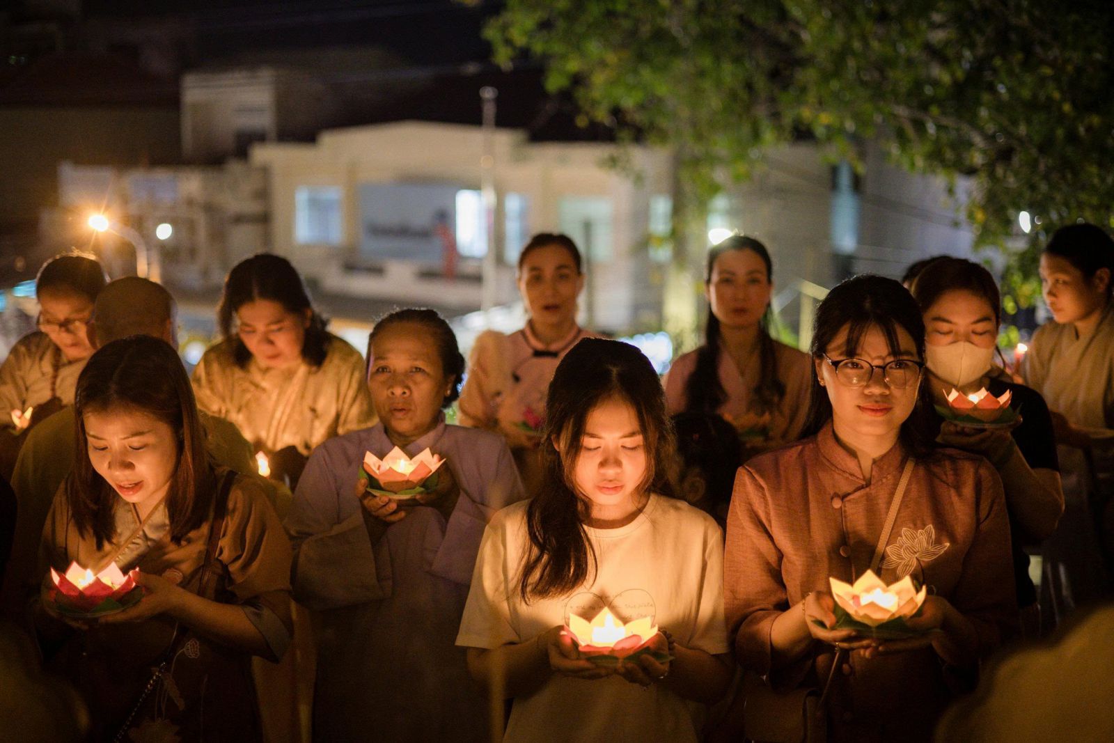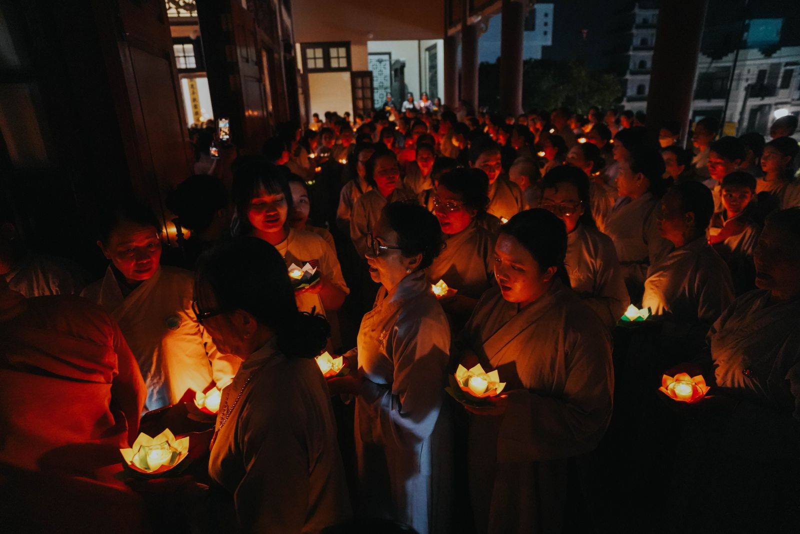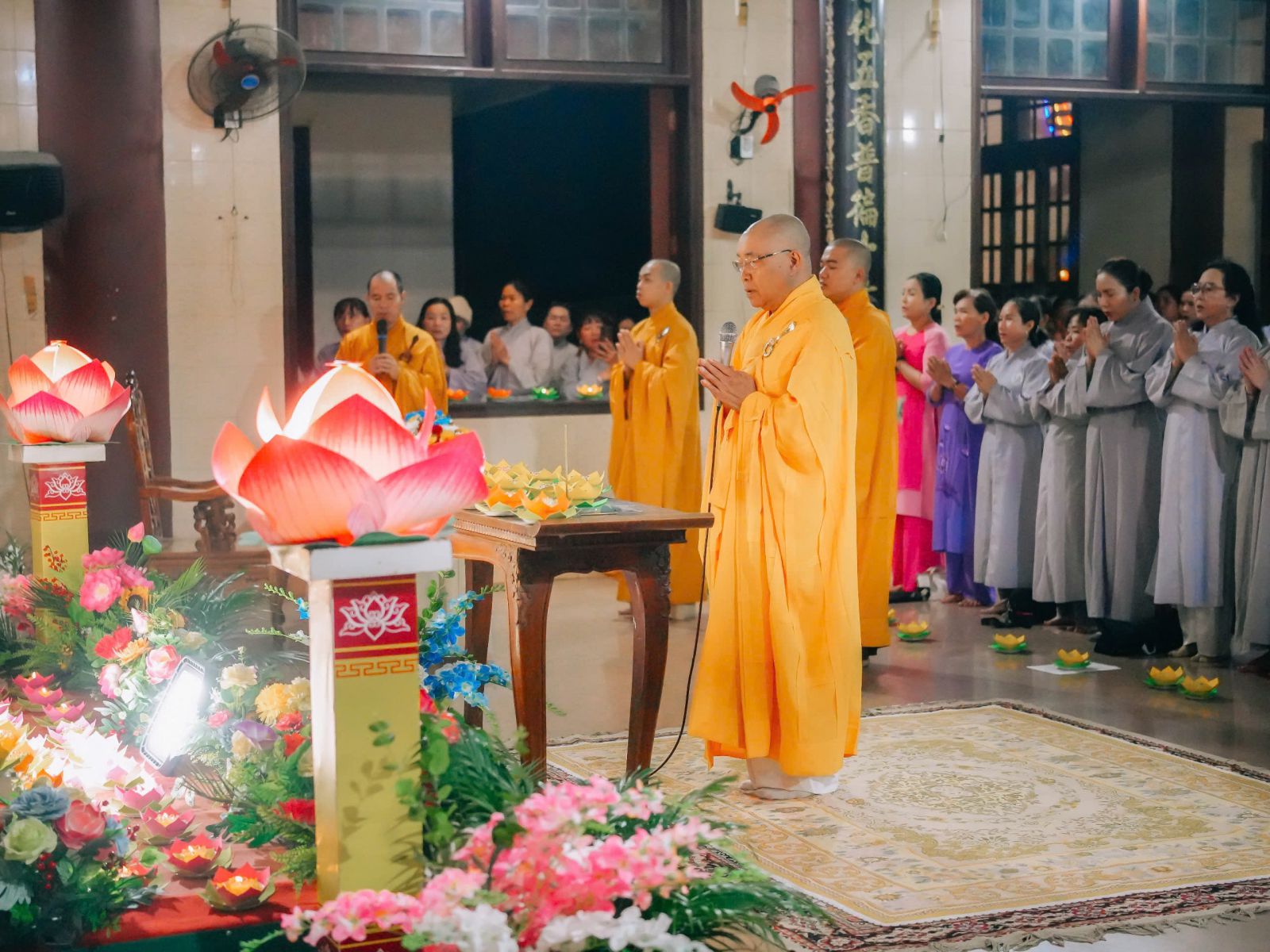 Trong không gian linh thiêng ấy, chư Tăng Ni và Phật tử tay nâng những đóa hoa đăng lung linh, chậm rãi kinh hành quanh chánh điện, đồng thanh tụng niệm danh hiệu Đức Phật A Di Đà. Tiếng kinh hòa quyện cùng ánh sáng hoa đăng lan tỏa khắp đạo tràng, tạo nên bầu không khí thanh tịnh, trang nghiêm và đầy chất thiền vị, khiến lòng người lắng dịu và hướng về nội tâm tỉnh thức.