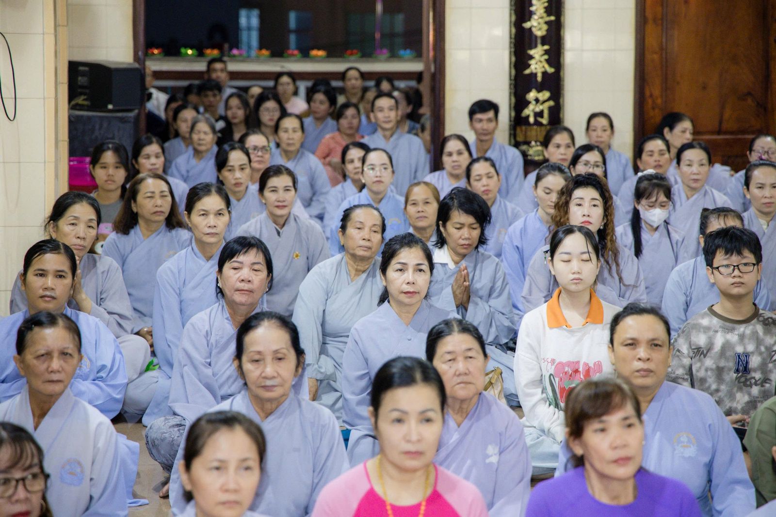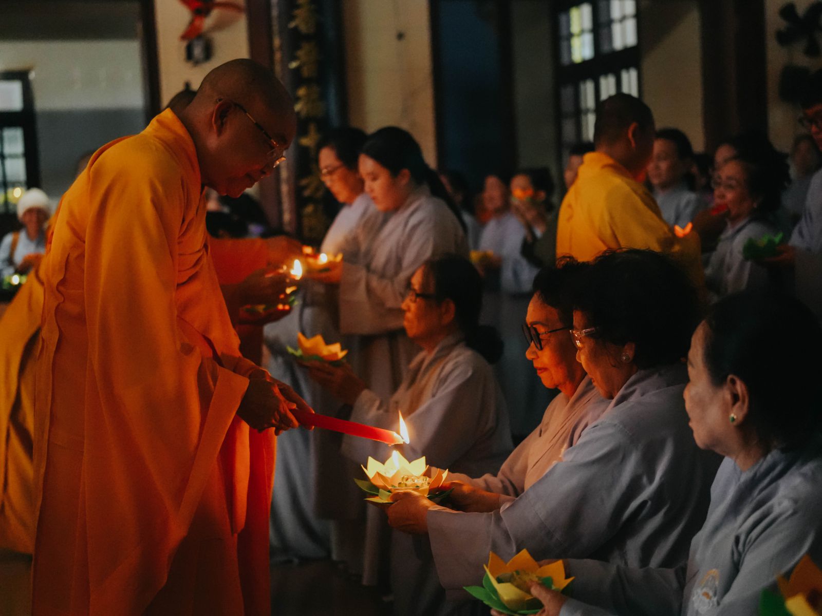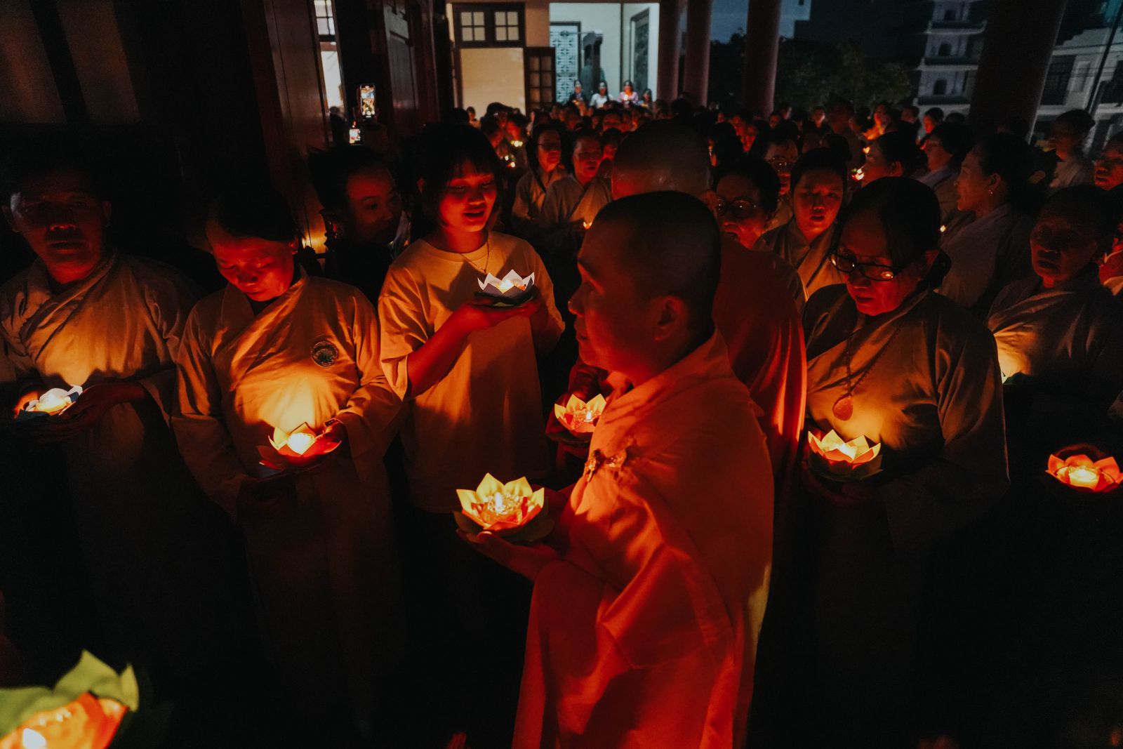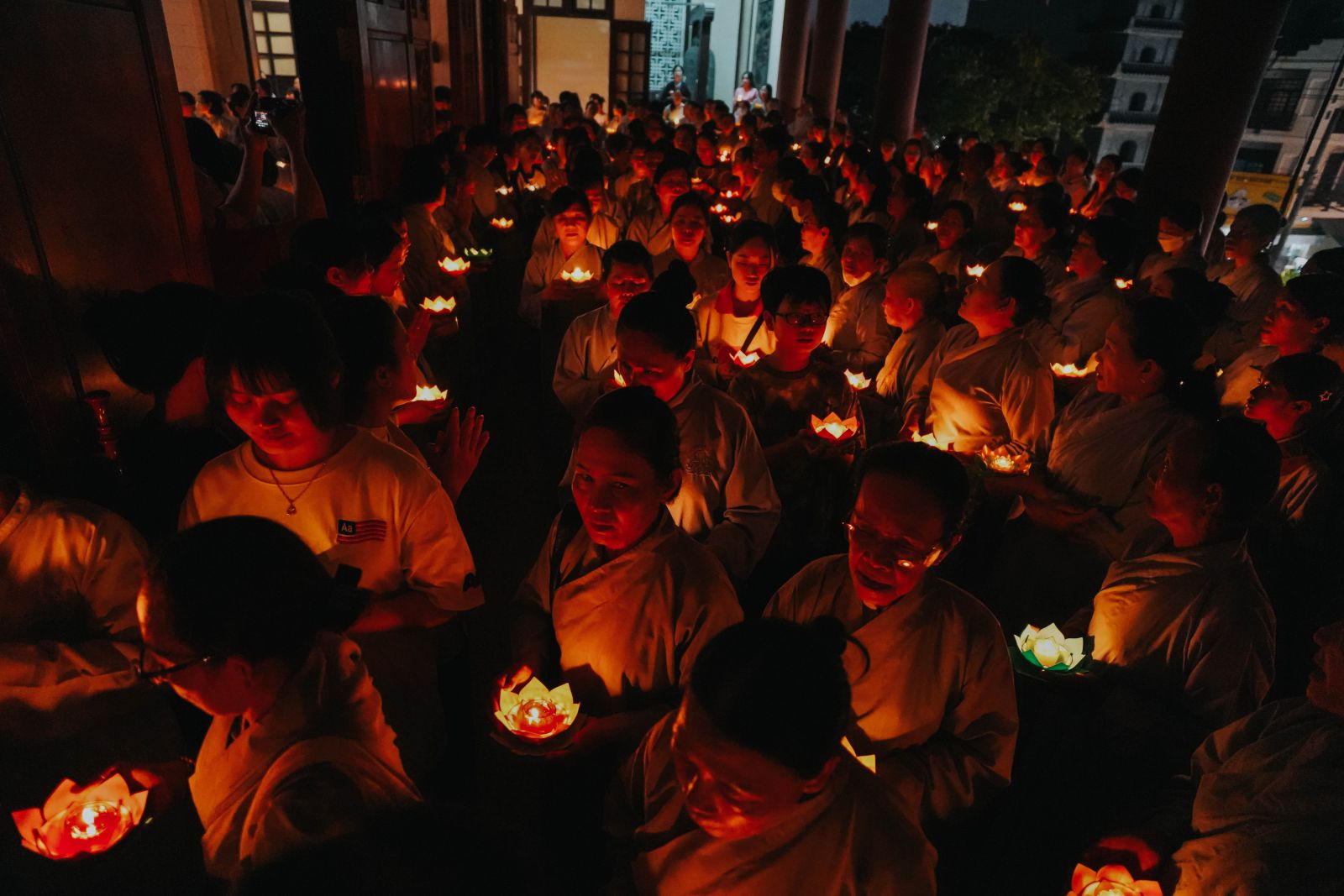 Trong không gian linh thiêng ấy, chư Tăng Ni và Phật tử tay nâng những đóa hoa đăng lung linh, chậm rãi kinh hành quanh chánh điện, đồng thanh tụng niệm danh hiệu Đức Phật A Di Đà. Tiếng kinh hòa quyện cùng ánh sáng hoa đăng lan tỏa khắp đạo tràng, tạo nên bầu không khí thanh tịnh, trang nghiêm và đầy chất thiền vị, khiến lòng người lắng dịu và hướng về nội tâm tỉnh thức.
